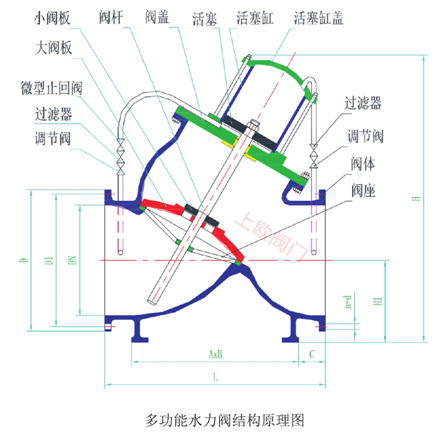 由主閥和外控組件構成。主閥由閥體、大小閥板、閥桿、閥蓋、閥座及活塞、活塞缸等構成,外控組件由微止回閥、調節(jié)閥、過濾器及相應管路構成。外控組件中一路連通閥進口端與活塞缸下腔,另一路連通閥出口端與活塞缸上腔