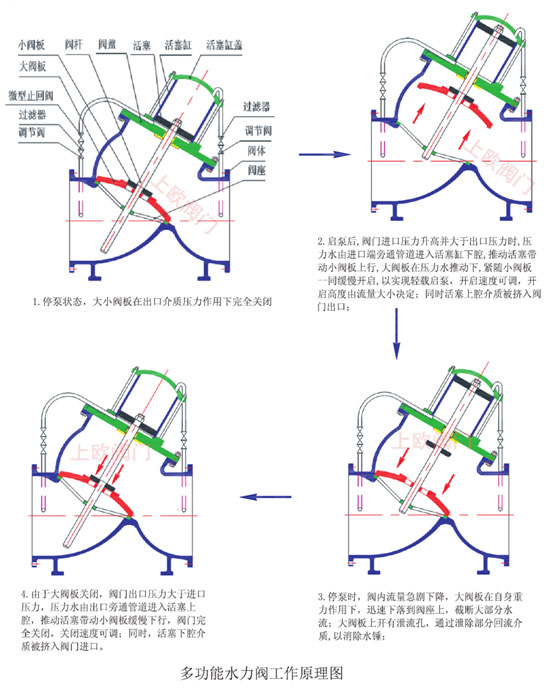 多功能水力閥的工作是用管網中的壓力水來驅動的,通過壓力水與水泵自動連鎖控制,無需人工干預。